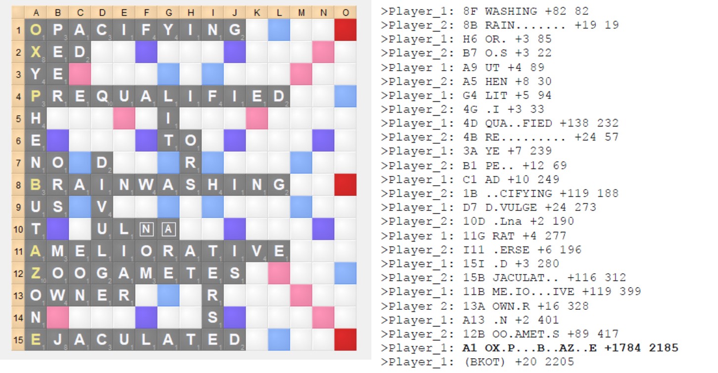 1. The highest scoring legal play is to make OXYPHENBUTAZONE across the left side of the board, hitting three Triple Word Score squares while making seven crosswords downward, for a total of 1,784 points. It was discovered by Jodi and Eric — Highest Play Board.